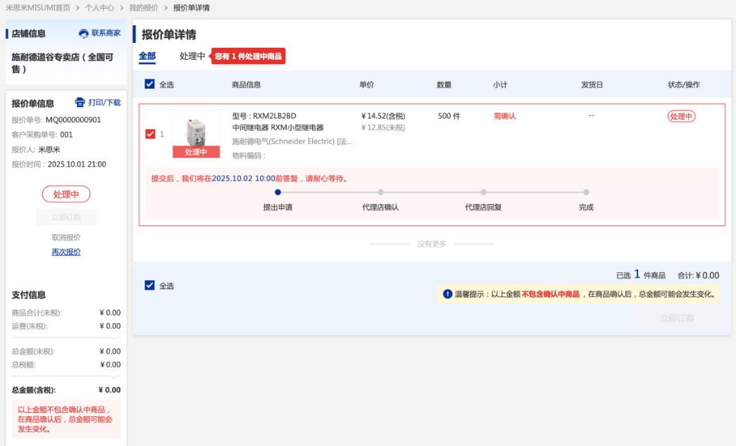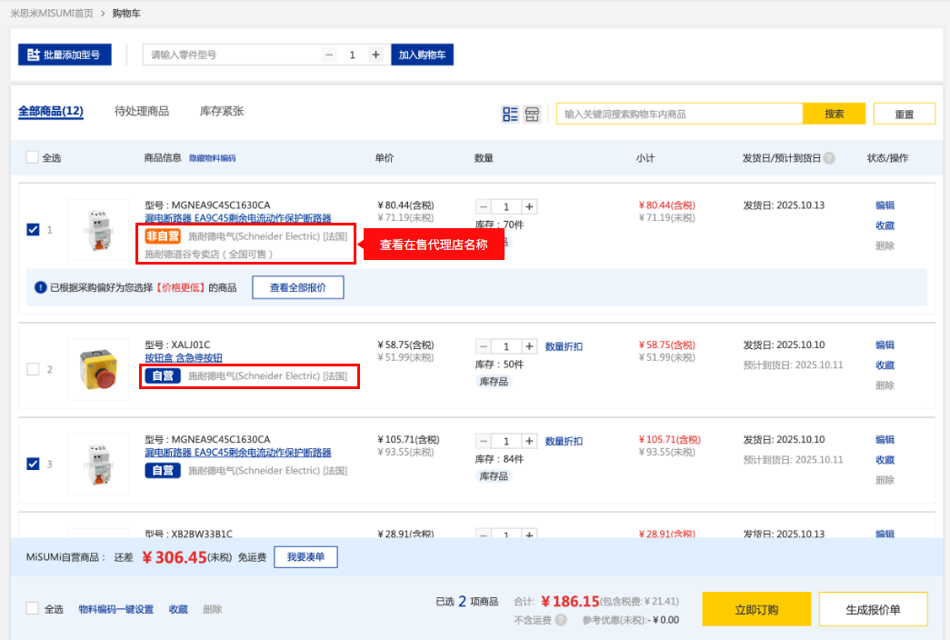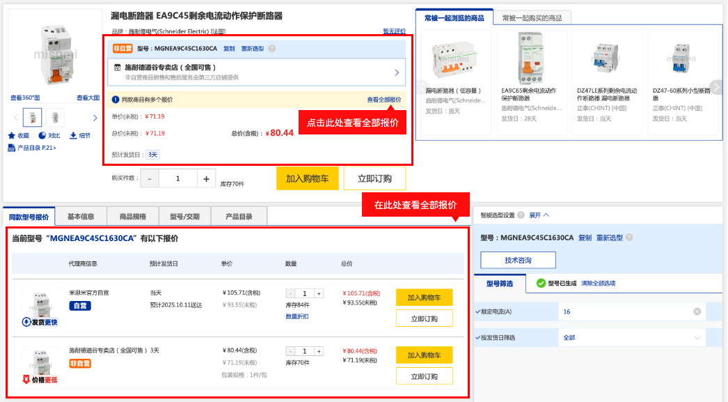在商品详情页选择型号后,如果该型号有米思米自营以及三方非自营店铺在售,则会展示同款型号多个报价。您可以自行选择订购。