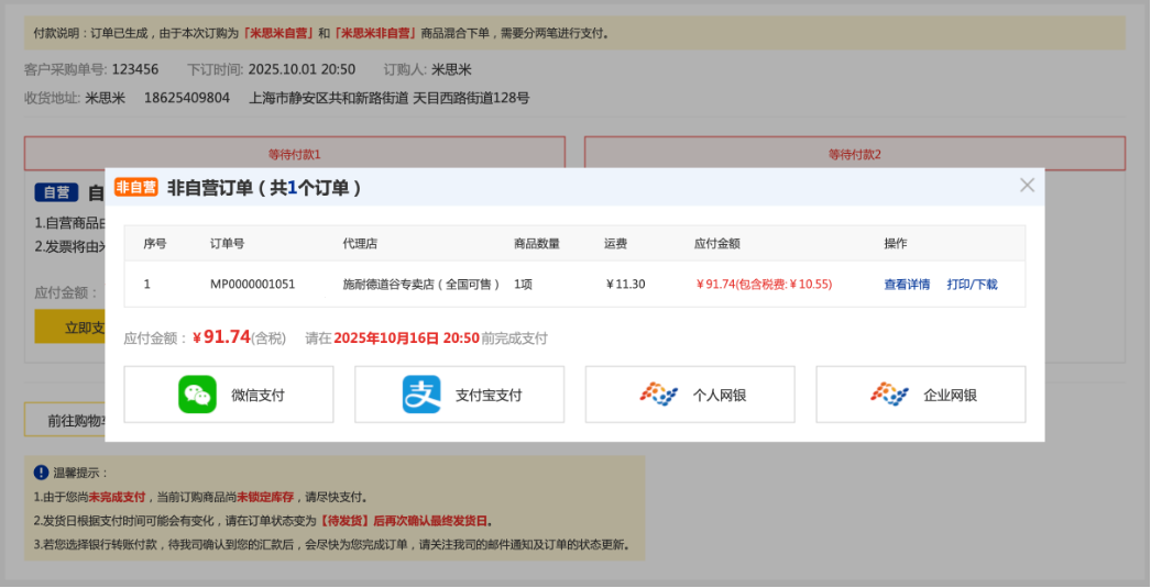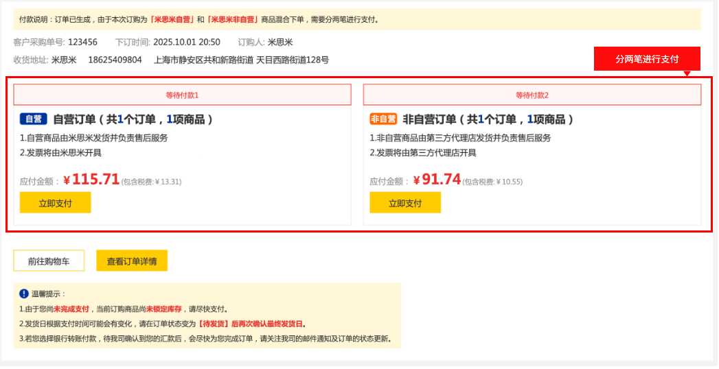 如果将自营商品和非自营商品合并订购,则会生成多个订单。同时,自营商品及分自营订单将需要分开2笔进行支付。