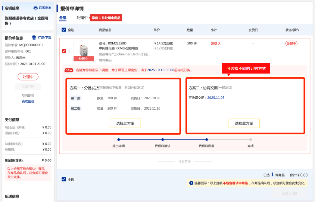 店铺回复后,可在不同报价方案中进行选择,请注意需要在店铺回复的有效期内完成订购,超过期限后报价将过期失效。