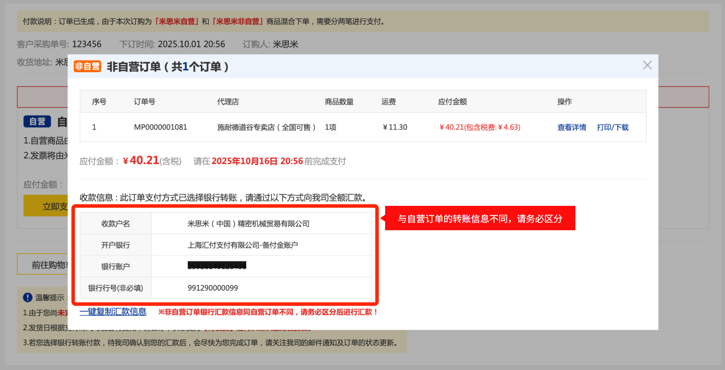 如果您选择银行转账支付,请务必注意非自营订单银行转账信息同自营订单不同,请注意区分。