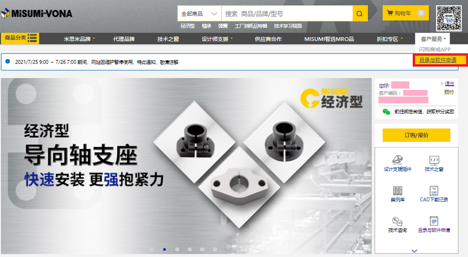 1.登录米思米官网后选择首页【客户服务】下拉框中的【目录与软件申请】。