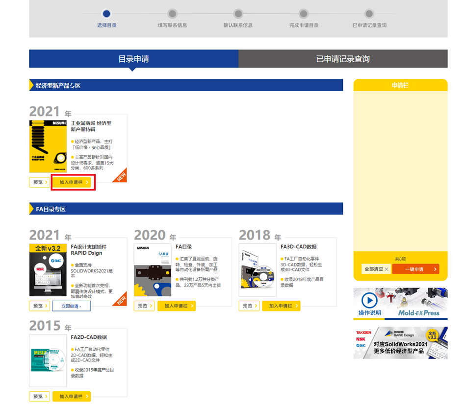 2.选择需要的产品目录,点击【加入申请栏】。