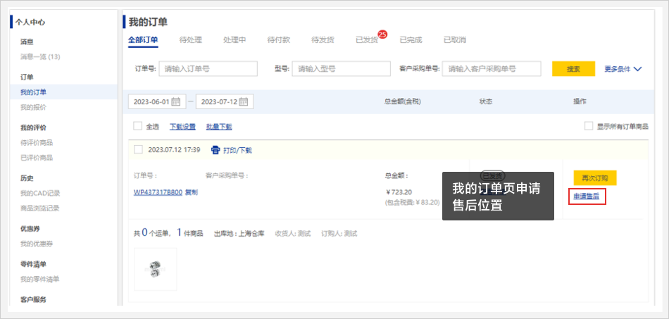 入口一:在【我的订单】页面,点击【申请售后】即可进入到退换货申请页面。