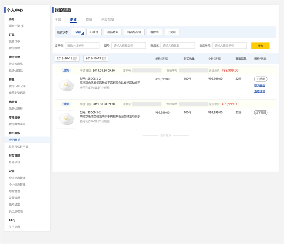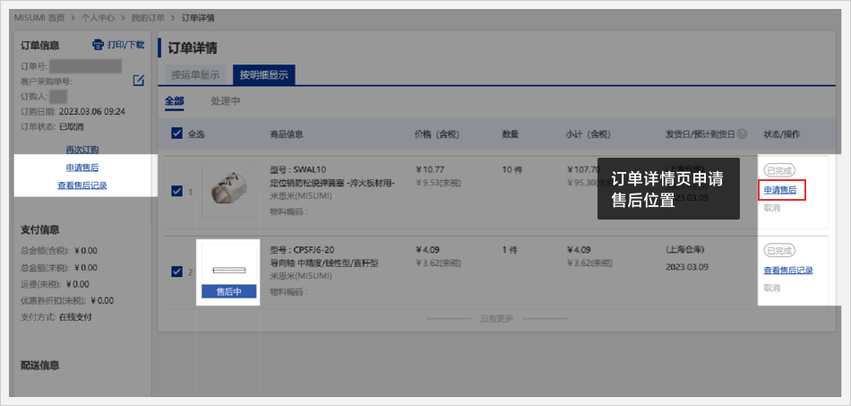 入口二:在【订单详情-按明细展示】页面,点击【申请售后】即可进入到退换货申请页面。