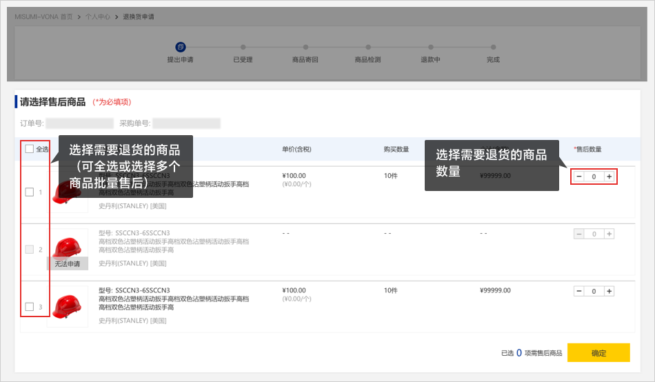 02进入【售后申请】页面,根据情况选择需要退货的商品