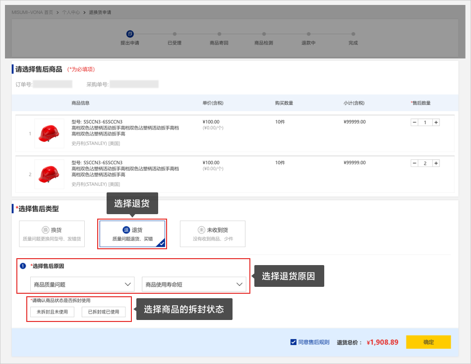 03确认退货商品后,在选择服务类型下选择【退货】,并选择退货原因以及商品的拆封状态