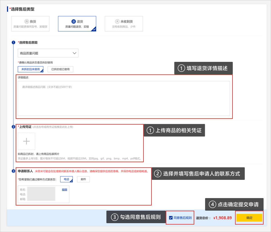 04根据退货商品的情况:①填写退货详细描述以及上传相关凭证。②确认售后申请联系人信息。③勾选【同意售后规则】。④点击【确定】按钮。