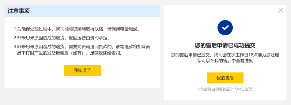 05点击【确认】按钮后,页面弹出注意事项对话框点击【我知道了】,显示【您的售后申请已成功提交】弹窗,即已完成退货申请的提交。