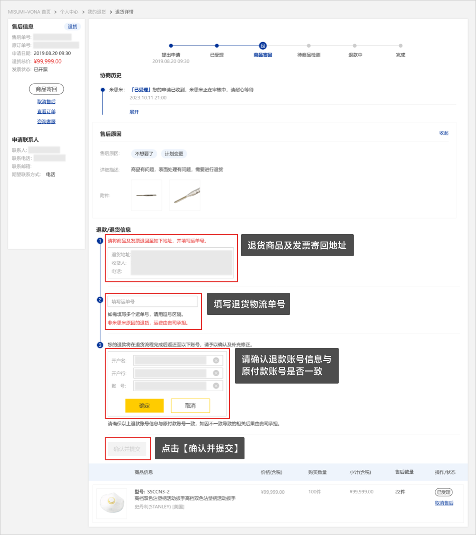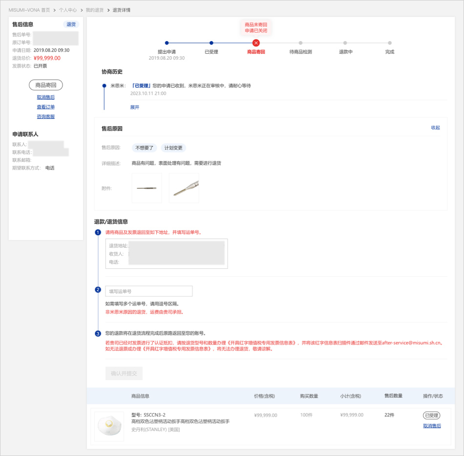 07退货申请通过后,您需要寄回退货商品,请将商品及发票退回至米思米提供的地址,并填写物流单号,同时请仔细核对以下信息,信息确认完成后
