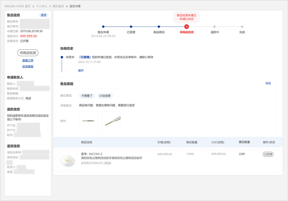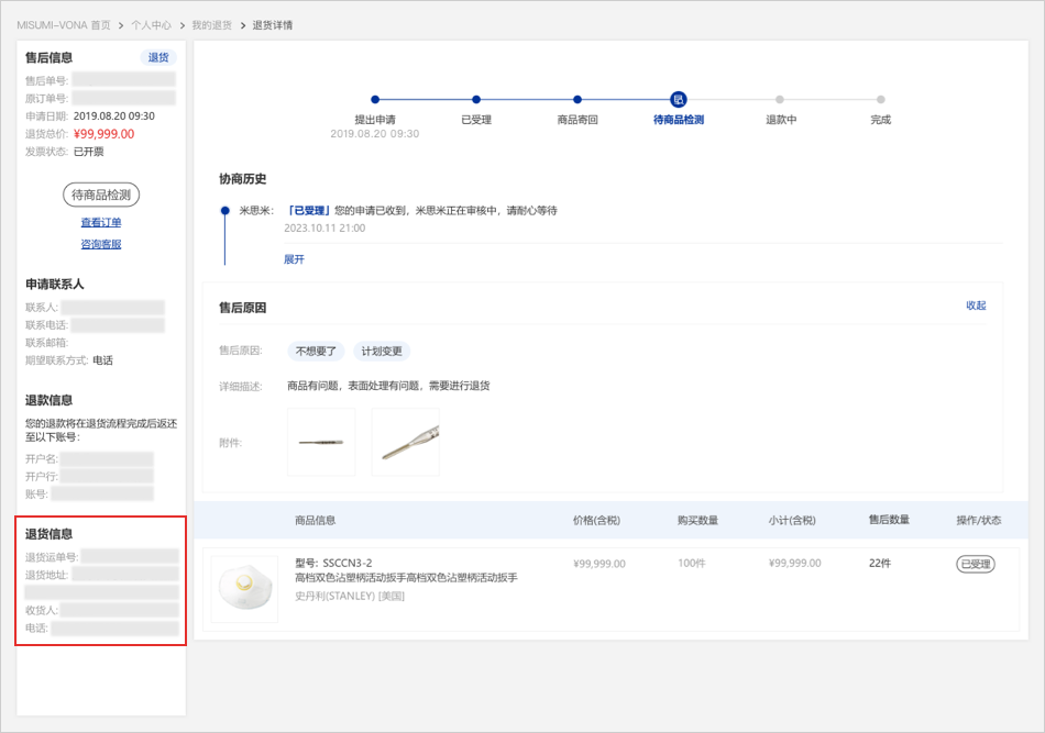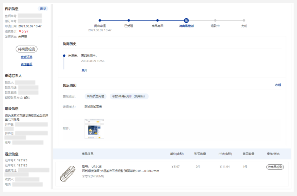 08当米思米收到退货商品后会进行商品检测,请您耐心等待。