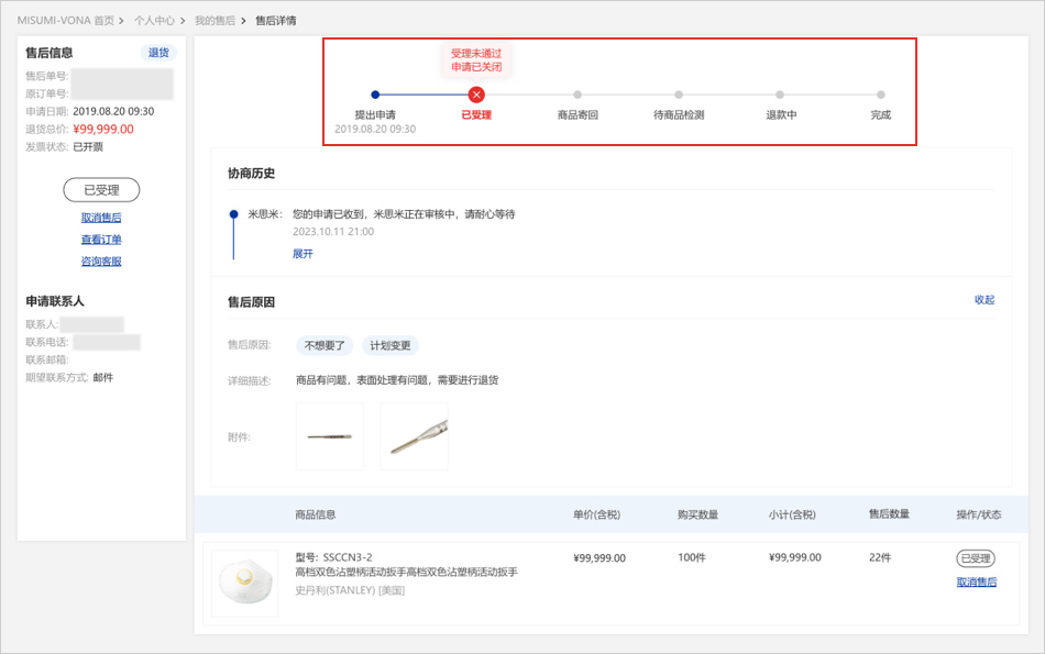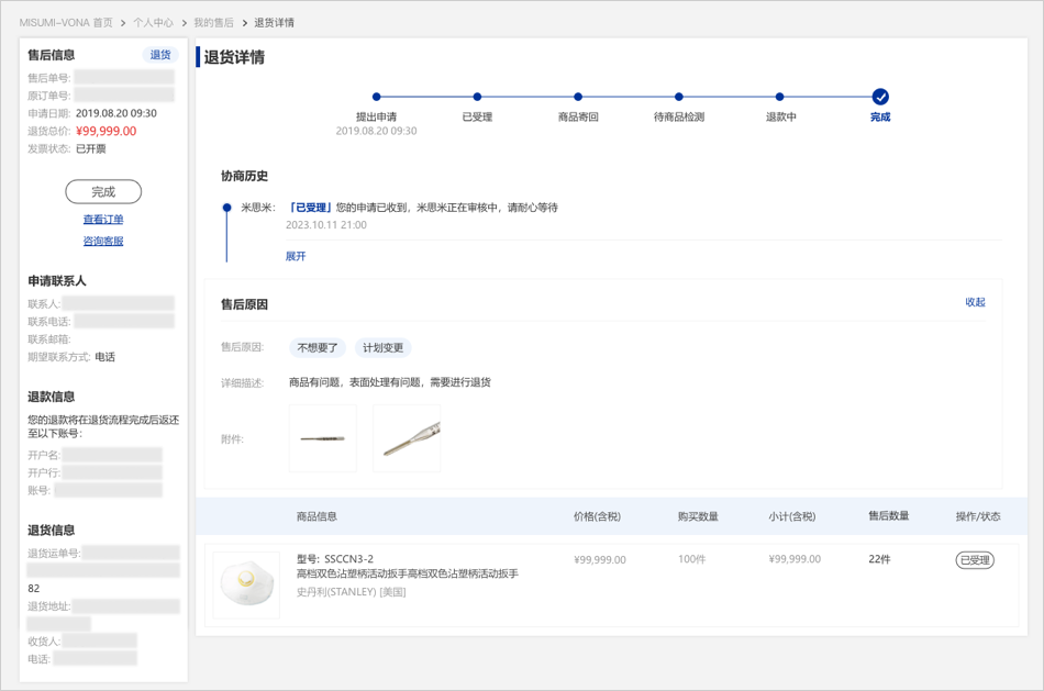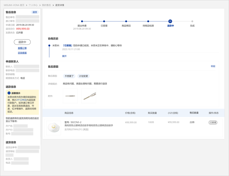 09当您的退货商品通过检测后,米思米将为您安排退款。
