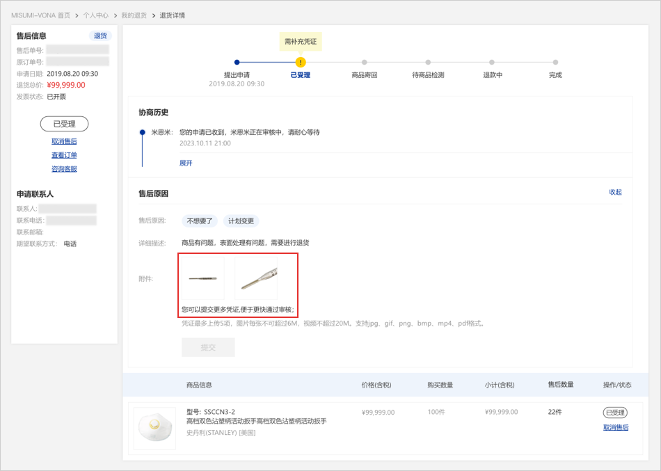如您的退货证据不足,米思米将会要求您补充凭证,您可以点击上传新的凭证或删除已上传凭证。