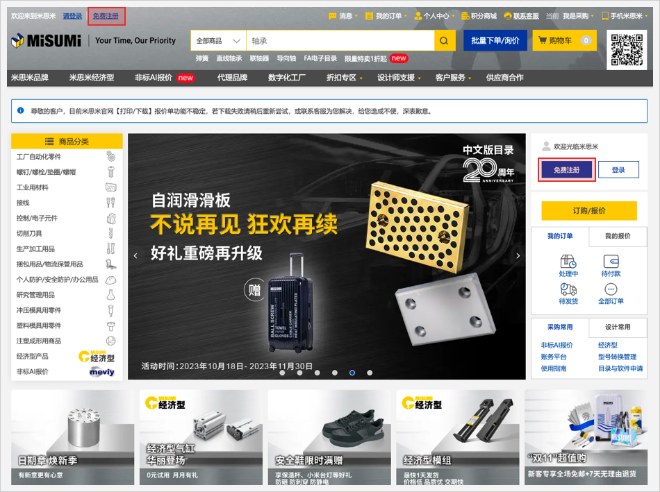 点击米思米首页顶部或右侧的【免费注册】。