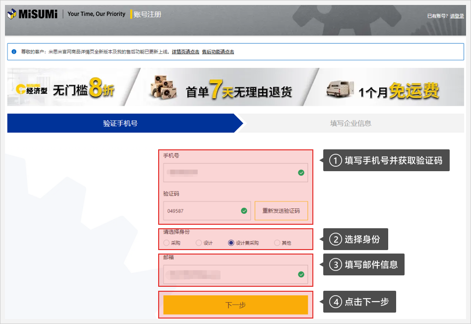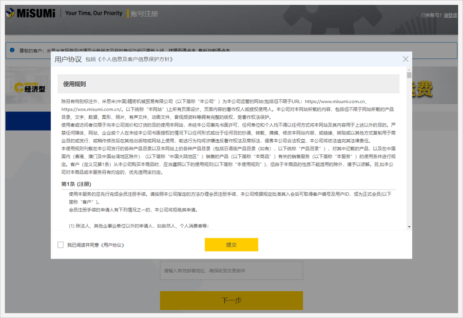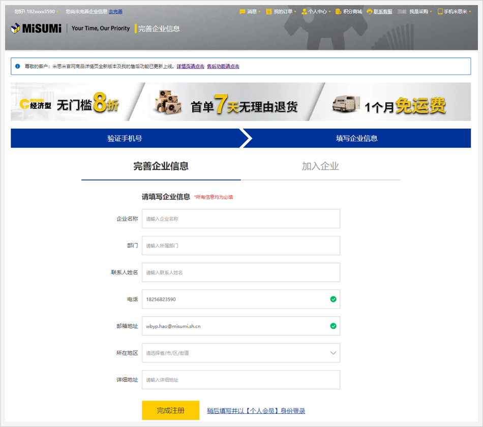 详情请查看: 个人用户如何升级为企业用户 https://www.misumi.com.cn/cmsweb/view/guide/5076/