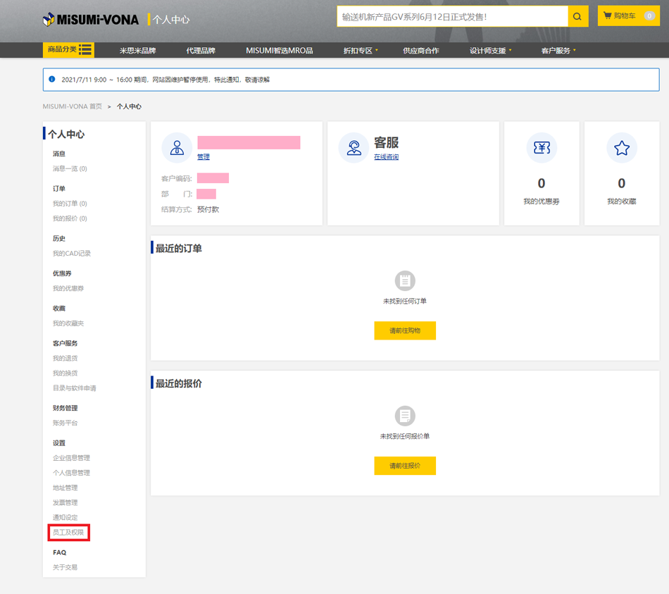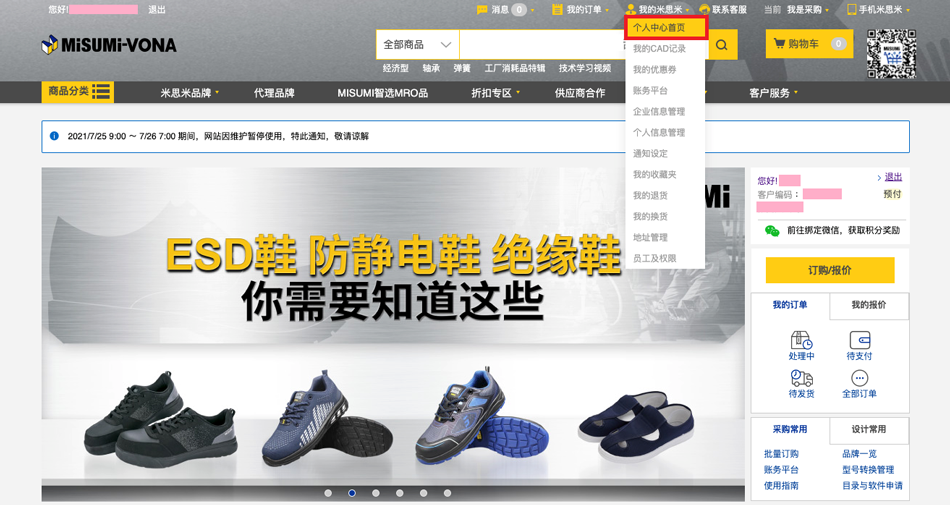 1.点击米思米官网首页【我的米思米】-【个人中心首页】。