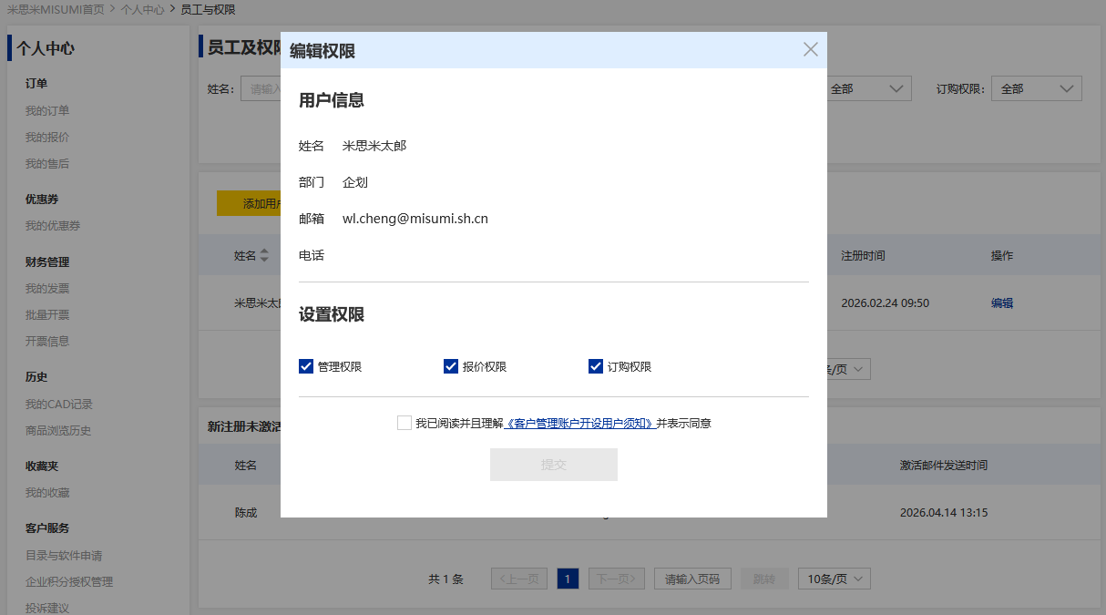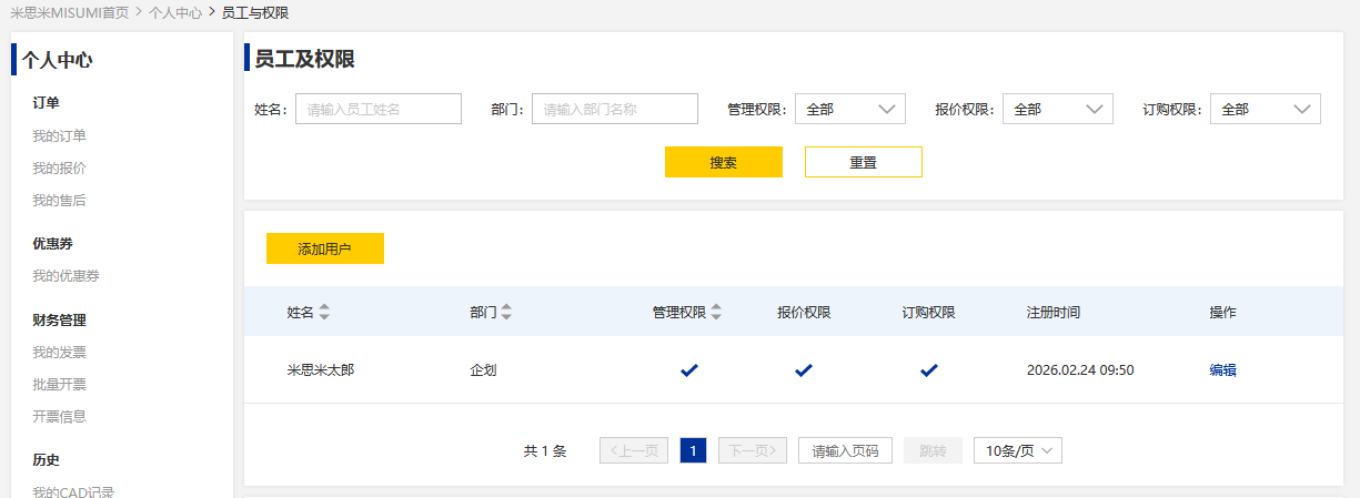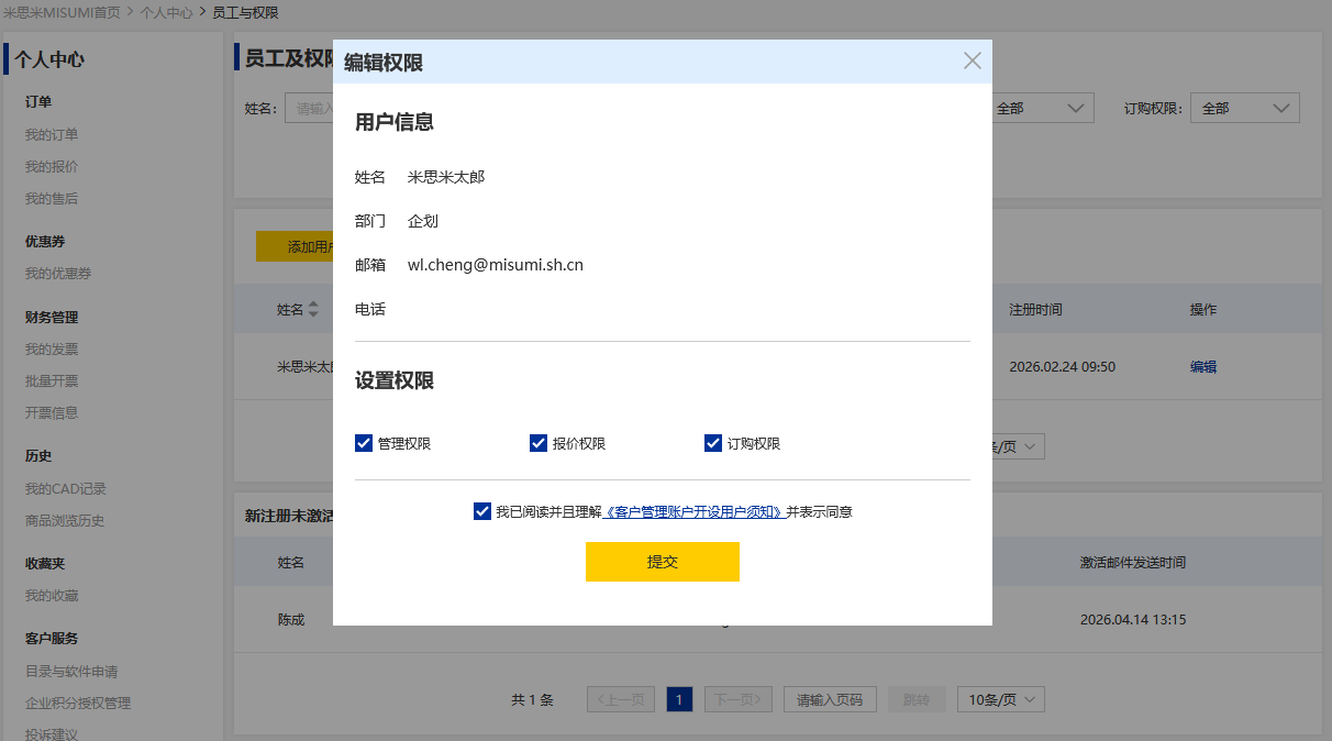 仅管理员账户可在员工及权限中修改员工权限。
