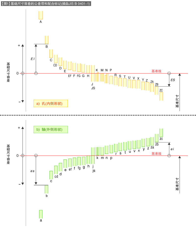 以轴为例,与孔的情况正好相反,从轴径小的负尺寸容差一侧开始,按照绝对值从大到小的顺序,从小写字母a开始与孔一样排列到与基准尺寸一致的h,h以后则向轴径正尺寸容差一侧一直排列到zc为止,也规定了标记进行分类(参阅【图1】b))